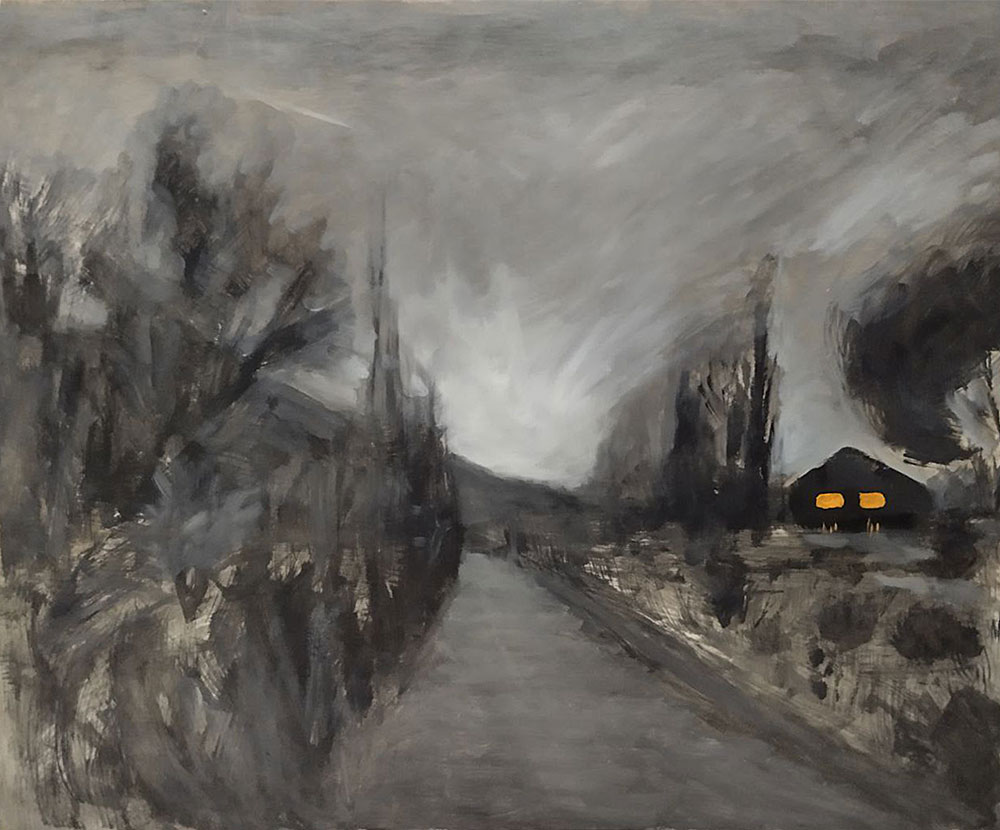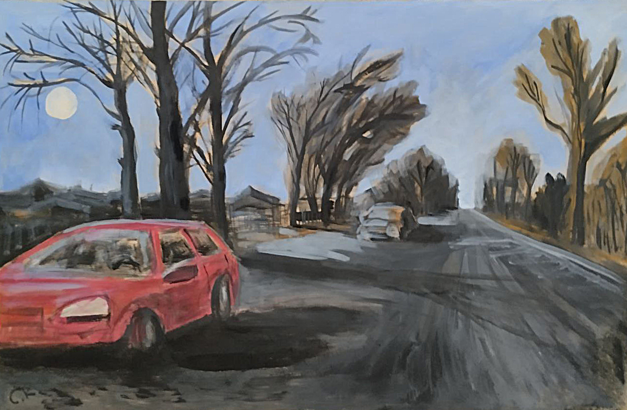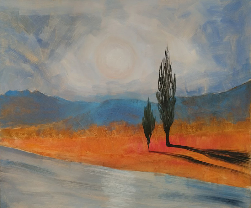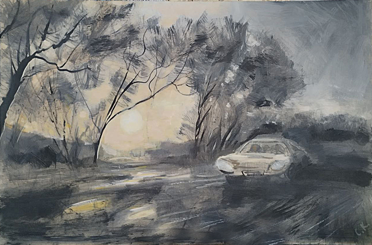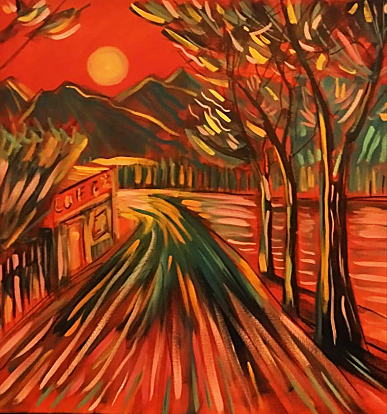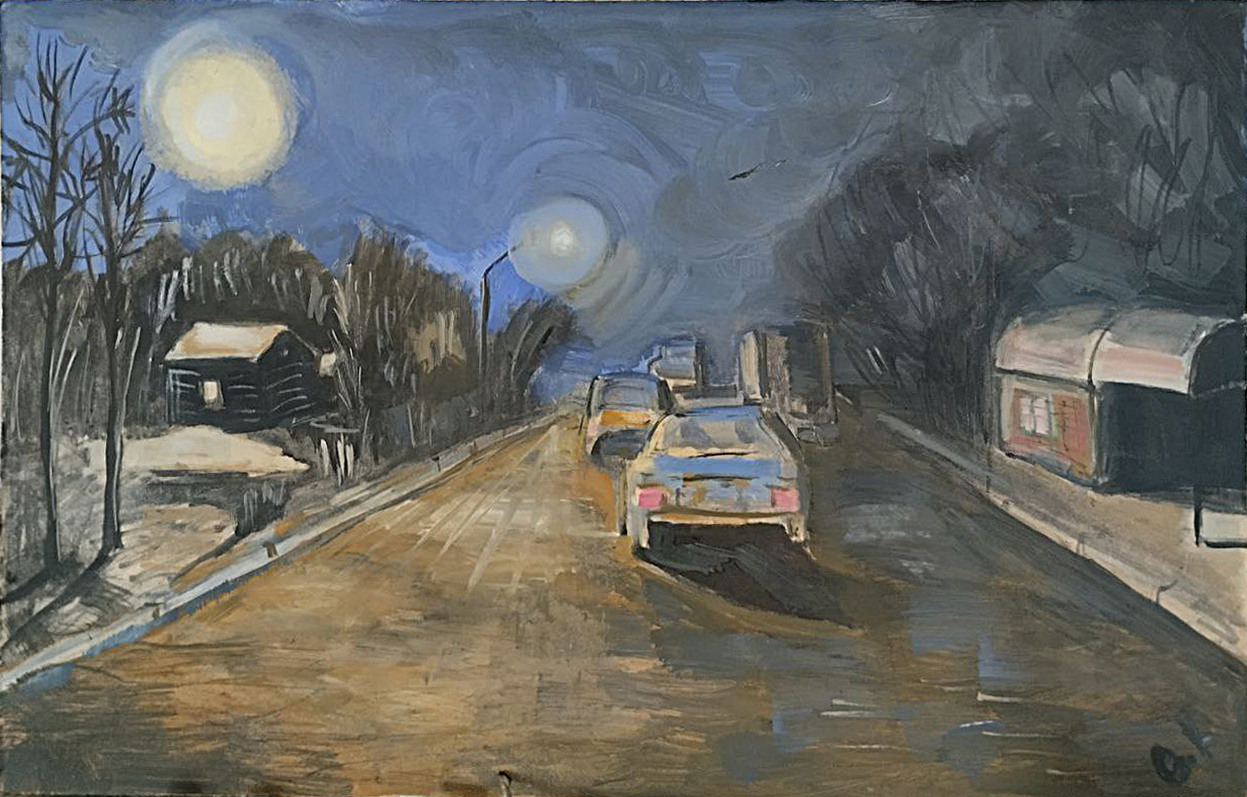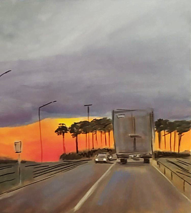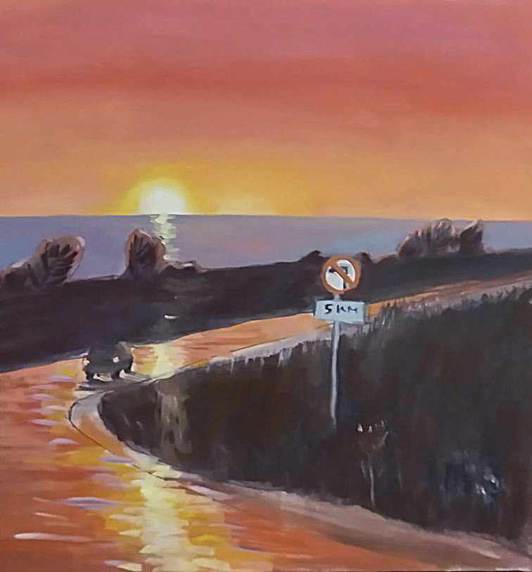 На берегу озера в лучах заката сверкает поворот направо, а слева тянется набережная, манящая к озеру. Однако, знак запрещает поворот налево. Картина намекает на всю условность человеческих правил на фоне восхитительного заката.