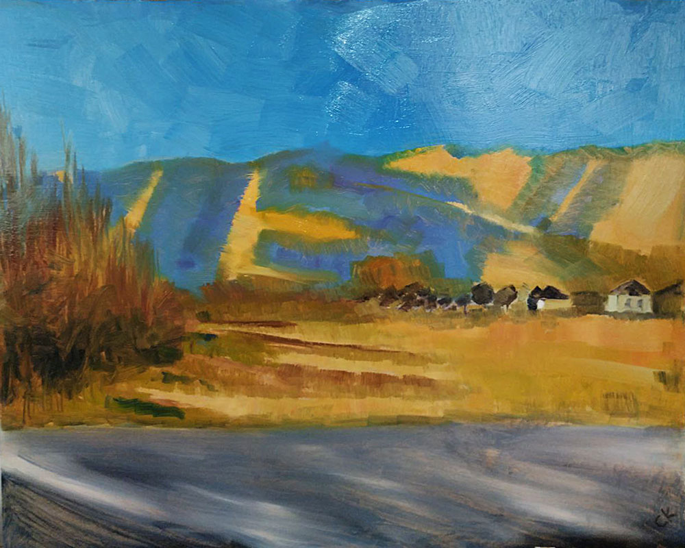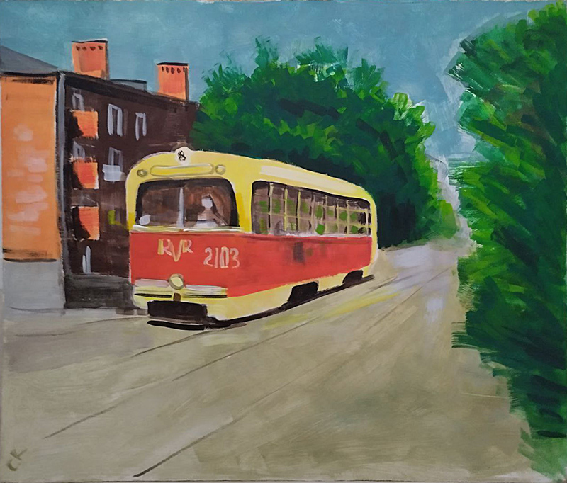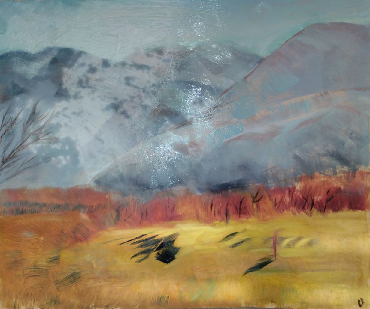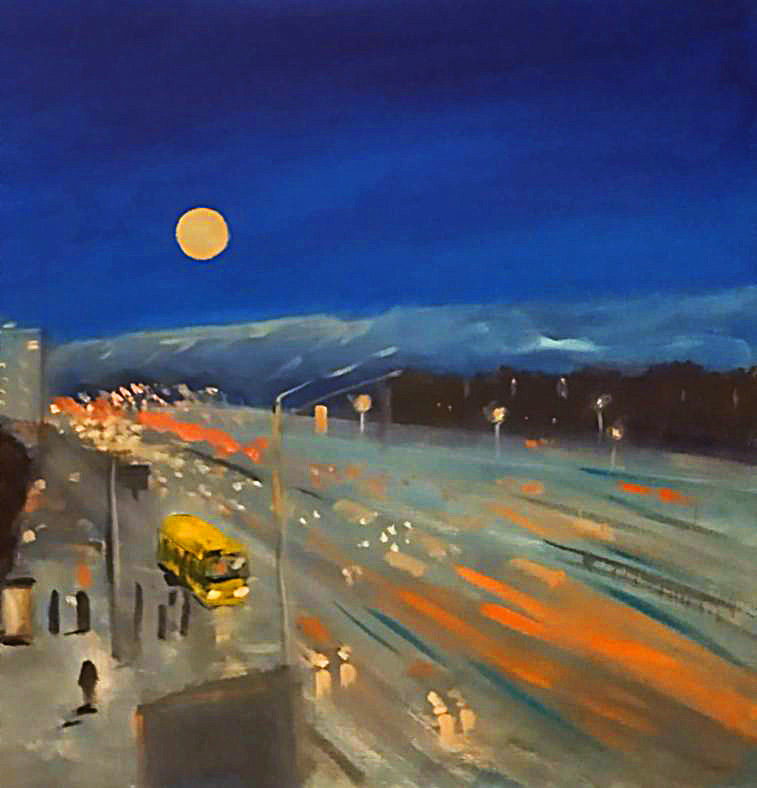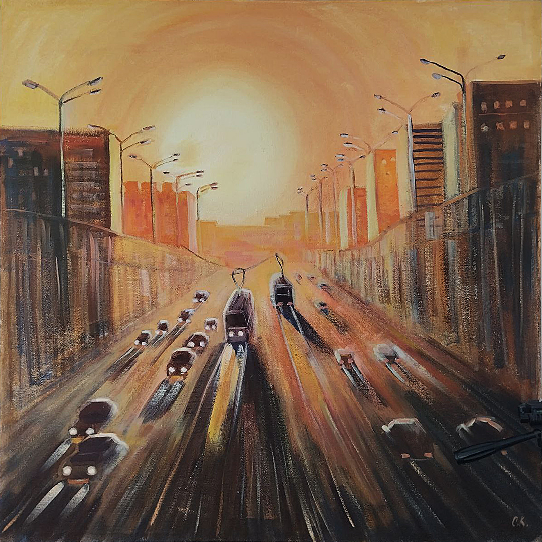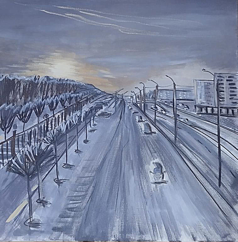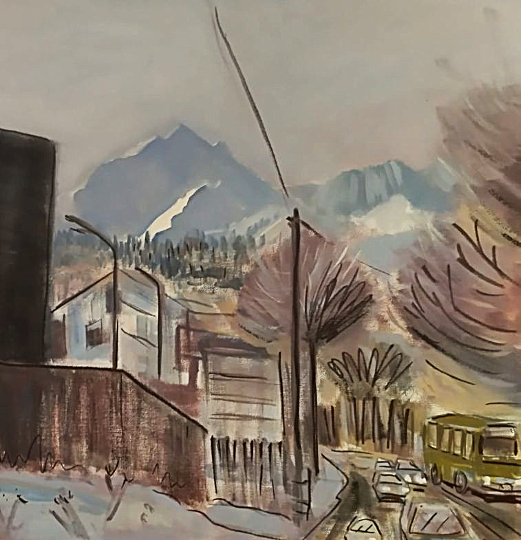 Утро в городе (Алматы), спешат по маршруту автобусы, несутся плотным потоком авто, сложная застройка города в сиреневой дымке перемежается с размашистыми кронами деревьев, а вдали над суетой высятся и сияют горные пики.